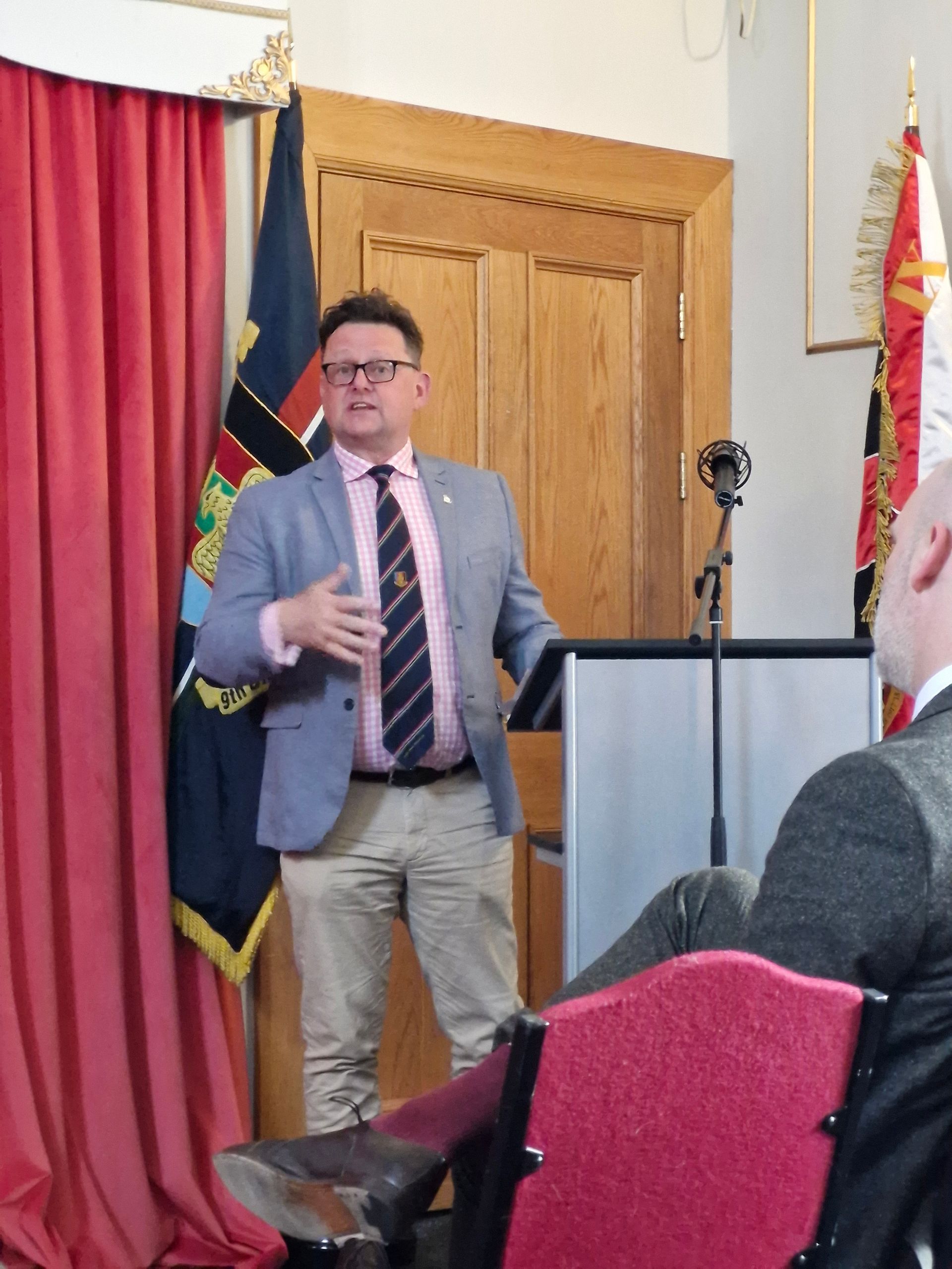 Prior to the room becoming silent, all attendees once again applauded in unison to introduce the esteemed Patron of the Ancre Somme Association Charity, Lieutenant Colonel Ant Maher. Lieutenant Colonel Maher expressed his gratitude to everyone present for their attendance and unwavering support for the charity. He proceeded to acknowledge and thank the members for their unwavering dedication to the charity and eagerly anticipated the opportunity to collaborate with them in the future.